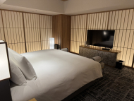• こちらはベッドルーム。キングサイズの大きなベッドにふっとチェアも完備。京都らしい和の装飾に落ち着いた木の香りが落ち着いた眠りを約束してくれます。個人的にはベッドの頭上にある装飾が好みです。