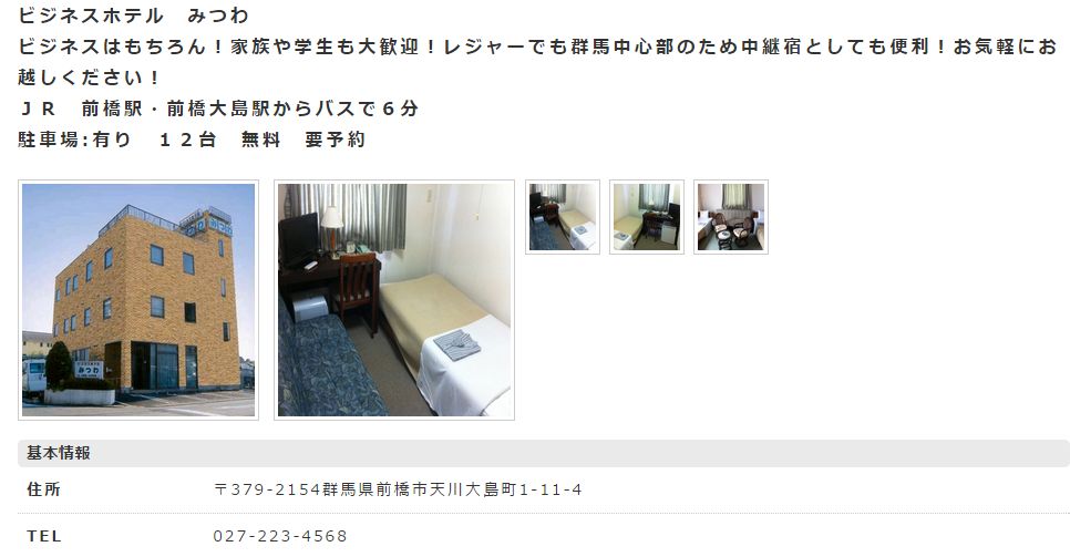 | ビジネスホテルみつわ | 前橋市天川大島町1-11-4 | 027-223-4568 | ![]() 50% |