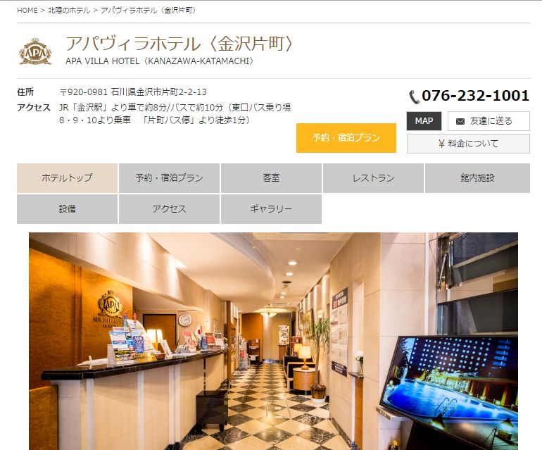 | アパホテル〈金沢中央〉 | 金沢市片町1丁目5-24 | 076-235-2111 | ![]() 100% |